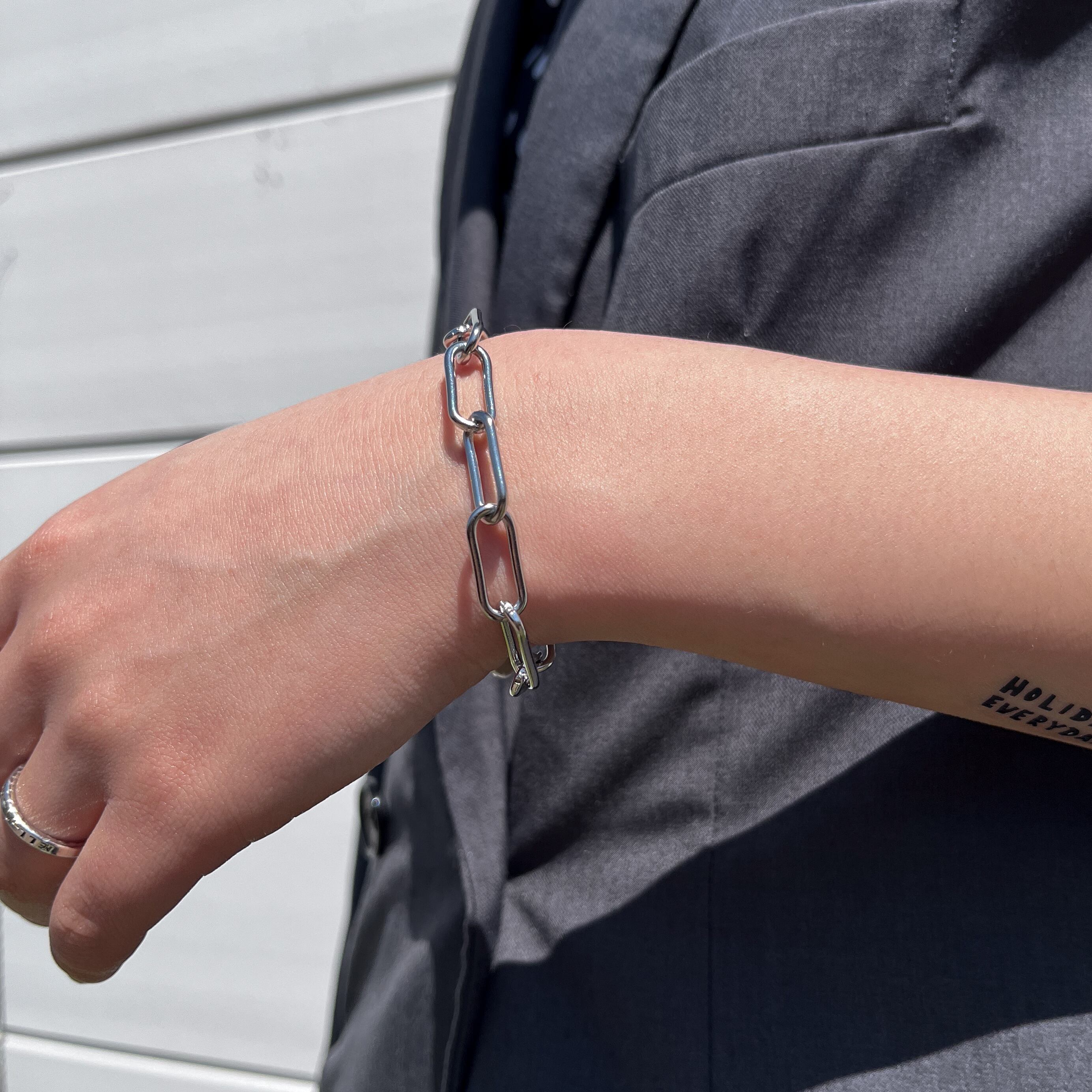 ・サージカルステンレを使用した、シルバーのチェーンブレスレット。